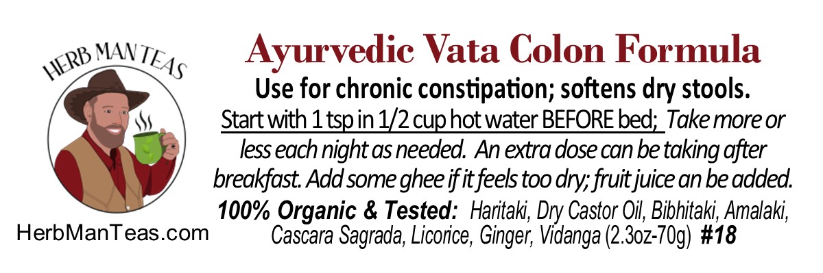 The base of the formula is called enrand haritaki, which is dried castor oil prepared in harkitaki, the premiere herb in Ayurveda for constipation and balancing vata in the colon. Castor oil is especially good for dry, hard stools as it lubricates the colon and helps remove the dryness. Bibhitaki and Amlaki are the other two herbs that go with Haritaki in the famous Ayurvedic formula Triphala for the colon. Licorice is added for its hydrating and soothing benefits. Ginger is added for the warming and digestive actions. A small amount of cascara Sagrada makes the formula a bit stronger, making this our strongest formula for constipation. Vidanga is added not just for its laxative effect but for its anti-parasitic actions.